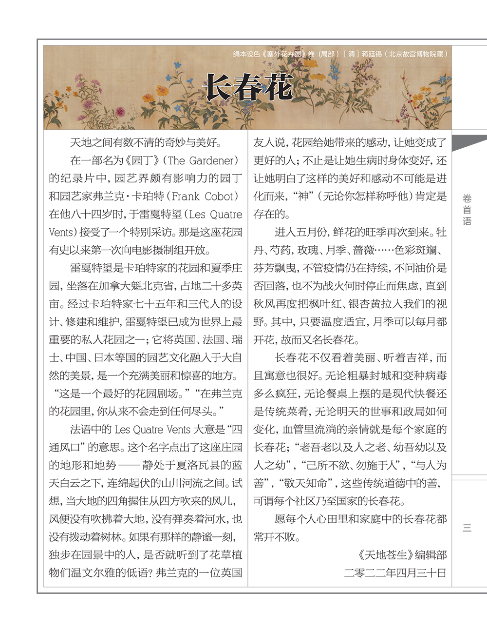 - 《天地蒼生》逢2月1日、5月1日、8月1日、11月1日發表。
